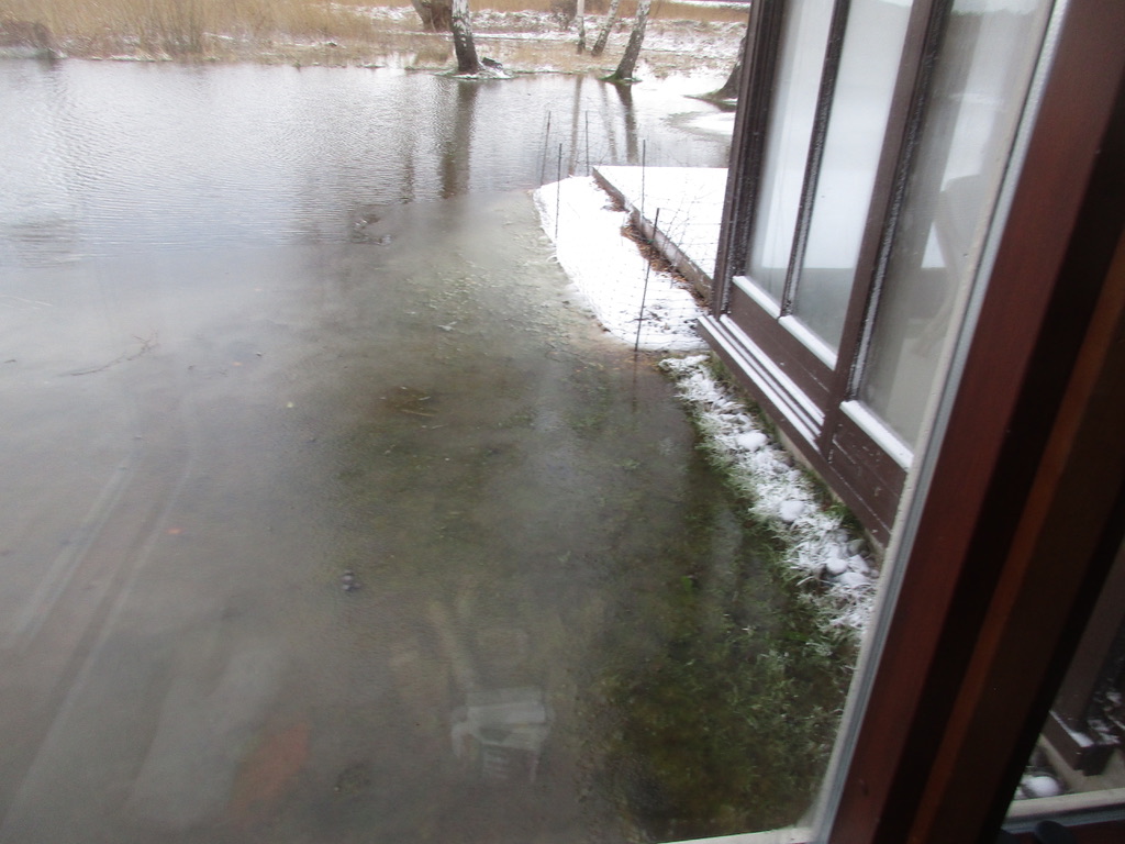 Über Nacht sind wir von Wasser umzingelt. Der kleine Fluss unweit des Hauses hat durch den ständigen Regen und Schnee die Wiesen um unser Haus herum überflutet und steigt an der Häuserwand immer weiter.