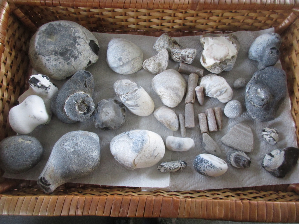 Vereinzelt ragten noch ein paar Äste vom Abbruch 2007 aus dem Wasser. Wir mussten über Kreidefelsen klettern, bis wir an Stellen kamen, wo wir die spektakulärsten Fossilien fanden. In der Mittagspause hieß es – Funde zeigen, wer hatte die tollsten! Es sind die Seeigel die uns am meisten faszinierten, Korallen, kleine runde Schwämmchen und Klappersteine kamen dazu. Donnerkeile sammelten wir nur noch ab einer bestimmten Größe, Isi hatte sich ausschließlich auf die Spitzen