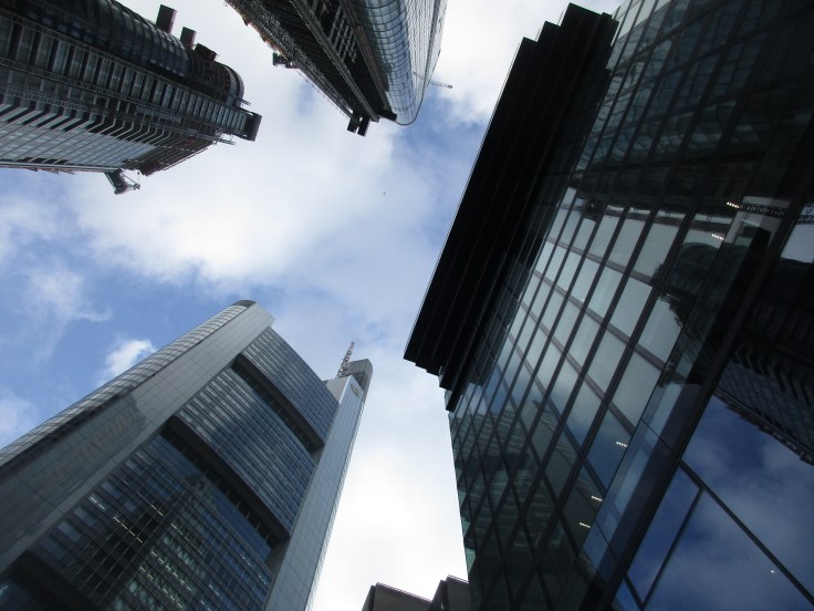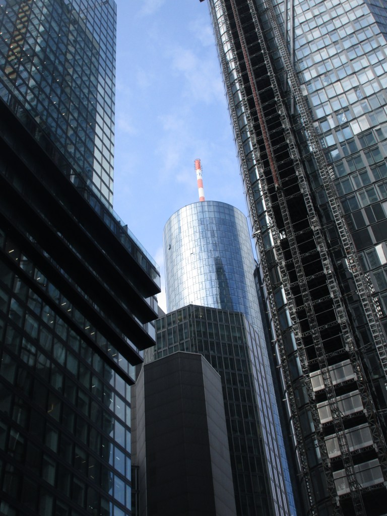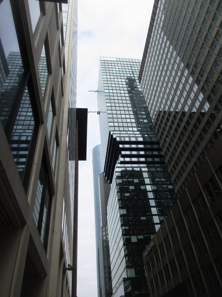 Zunächst tauchen wir fussläufig ein. Die meiste Zeit haben wir die Augen in den Himmel gerichtet. Wir machen so lange und so viele Fotos in der Bankencity, dass wir glatt angesprochen werden, ob wir vom Fernsehen sind. Die besten Fotos entstehen, wenn man die Kamera himmelwärts hält, wo die Hochhäuser zusammenlaufen.