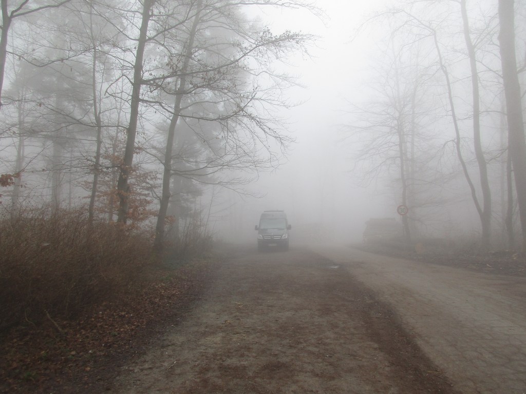 Den nächsten Morgen befinden wir uns auf einem kleinen Parkplatz an einer Anhöhe an einem Teich in vollkommener Ruhe und Abgeschiedenheit. Wir können lange ungestört weit ins Land schauen. Der Trecker zieht auf dem Feld seine Runden, Windräder kreisen langsam. Bis die üblichen Hundebesitzer zum Gassigehen eintreffen und wir Richtung Heimat fahren, vergeht der halbe Tag.