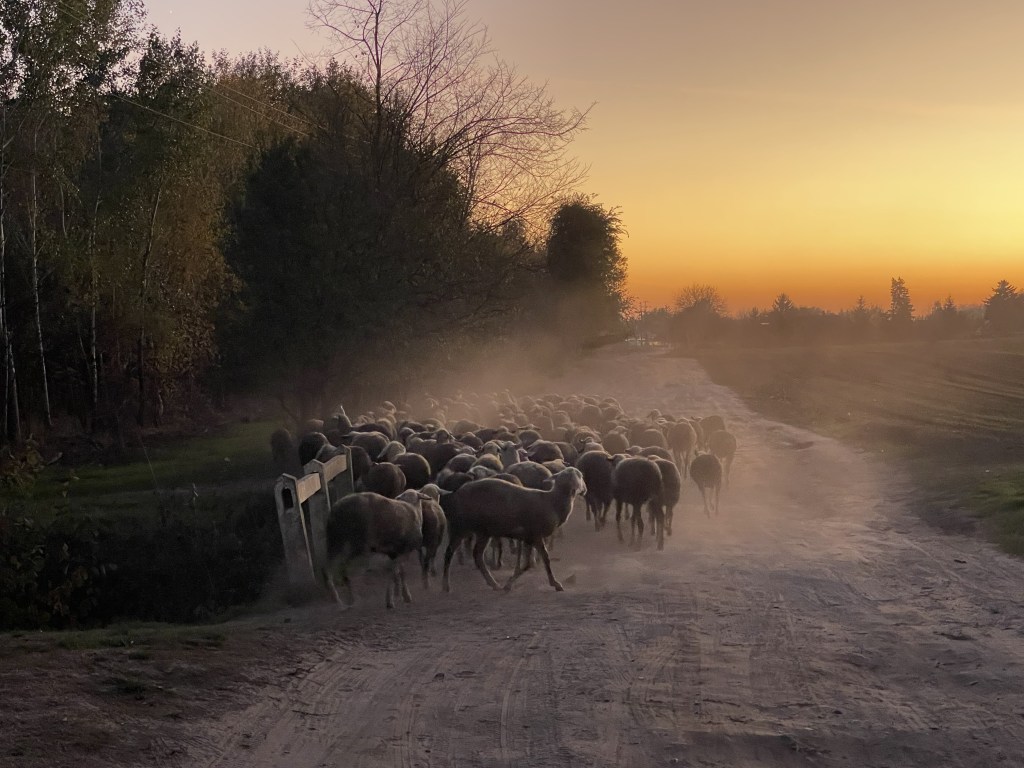Am Abend stehen wir in ländlicher Umgebung am Rande von Kecskemet. Noch bevor die Dunkelheit eintritt suchen wir uns die Übernachtungsplätze. Meist runden wir den Tag mit einem Spaziergang ab und sehen diesmal eine Schafherde samt Schäfer im Sonnenuntergang verschwinden.