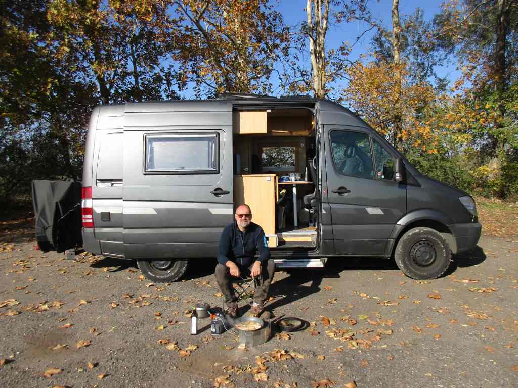 Etwas weiter oben stehen noch einige Womos und sogar Zelte, dahinter noch ein weitläufiger Dauercampingplatz mit Parzellen, in denen abgemeldeten Womos überwintern.