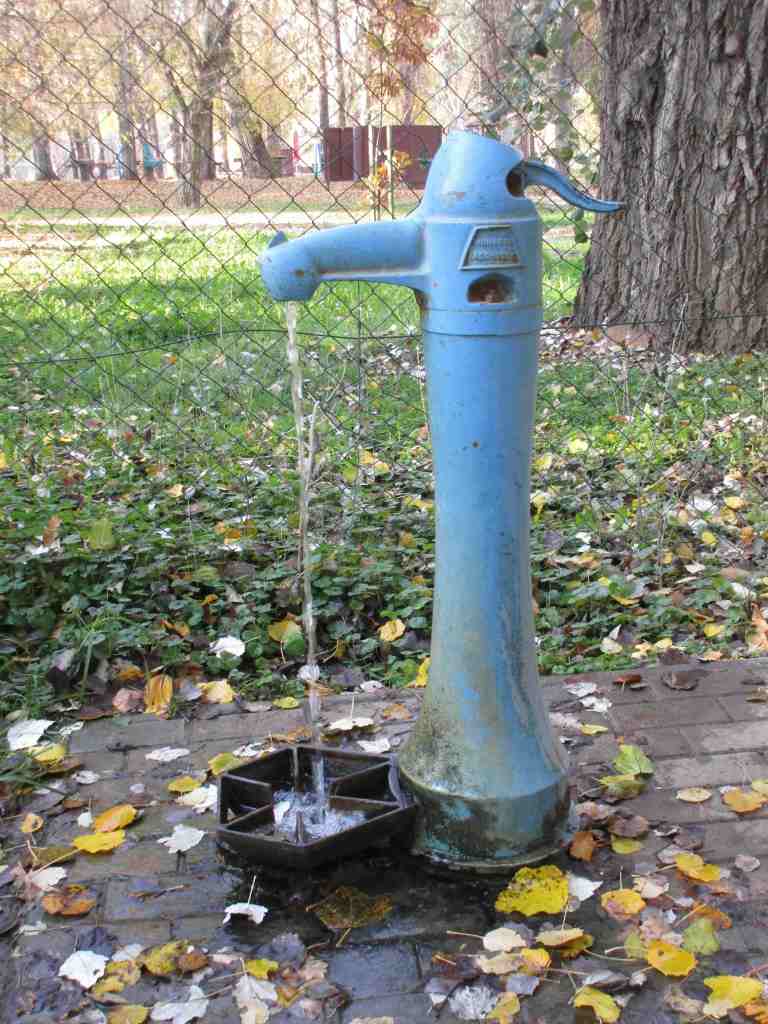 Gestern haben wir geduscht. Hendrik musste deshalb den Wasservorrat mit einem Kanister aus dieser blauen Pumpe wieder auffüllen.