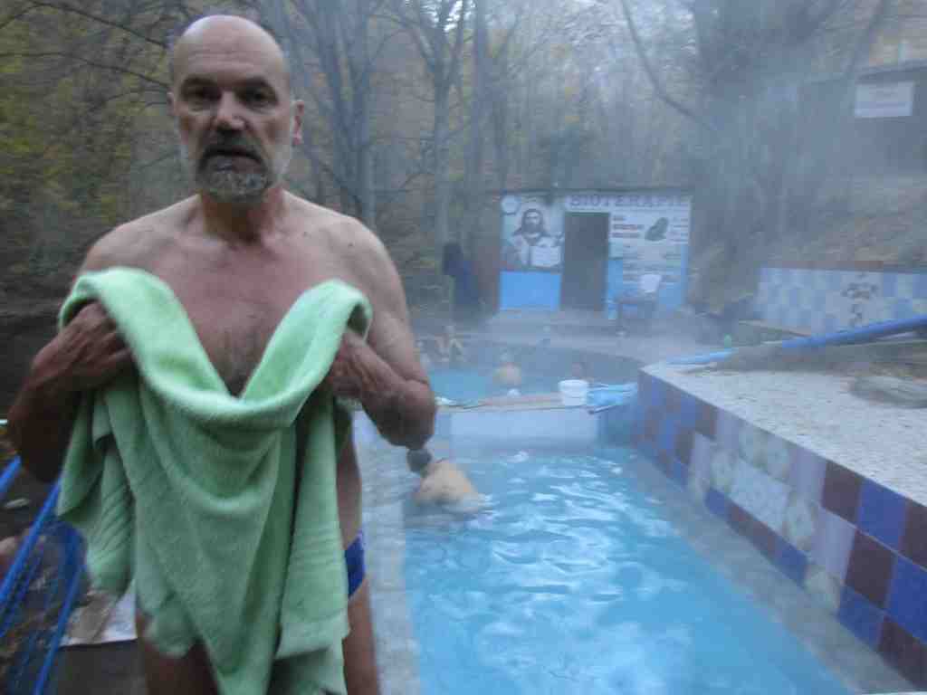 Was am späten Abend noch pure Erholung war, ist am Morgen echte Herausforderung für den Kreislauf so ohne Frühstück. Das Quellwasser ist so heiß – ich bekomme danach Schnappatmung und bin froh danach im Womo in Schräglage gehen zu können. Hendrik hat es gut vertragen. Das ganze bei 0 Grad Außentemperatur. Im Becken sitzen wir mit Mütze.