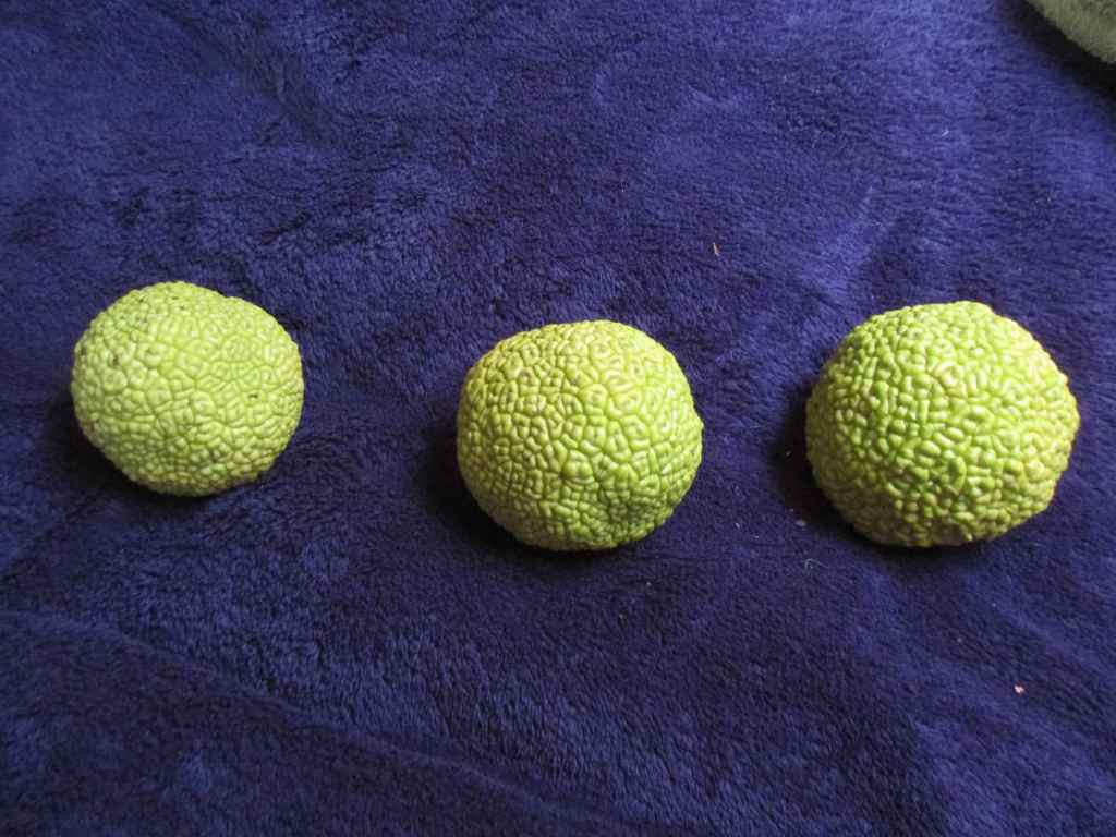 Übrigens wer bis hierhin gelesen hat – die drei Tennisbälle sind die Früchte vom Milchorangenbaum.