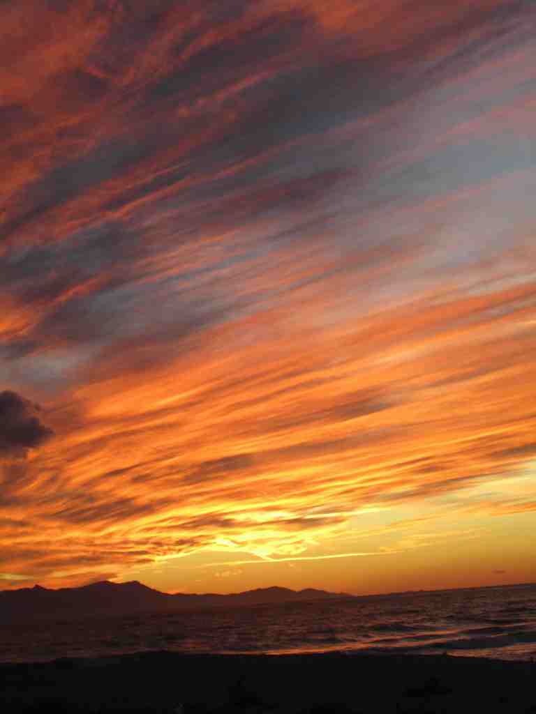 Um 07:30 Uhr Sonnenaufgang mit ähnlich dramatischem Himmel wie gestern der Sonnenuntergang. Morgens haben wir wieder Hundebesuch – Katzis wären uns lieber.Sie tun uns zwar leid, aber Hendrik erklärt ihm, dass er der Chef ist. Da trollt er sich gegenüber auf die Müllkippe. Als wir nächsten Tag wegfahren, bekommt er doch noch sein Leckerli von uns – dem traurigen Blick kann doch niemand widerstehen!