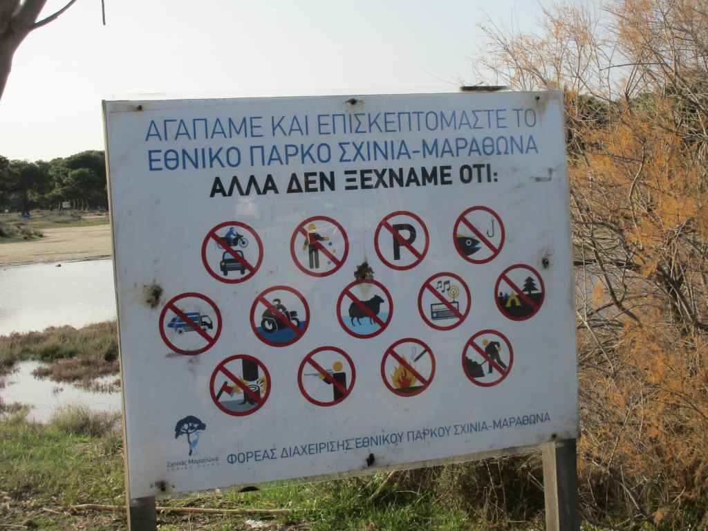 Wir befinden uns in der Nähe des Nationalpark Schinias-Marathon. Die Bucht vor dem Nationalpark ist riesig. Über Nacht können wir hier nicht stehen. Der Ranger ist schon da und beäugt uns skeptisch, dazu jede Menge Verbote – gibt es eigentlich noch mehr als auf diesem Schild?