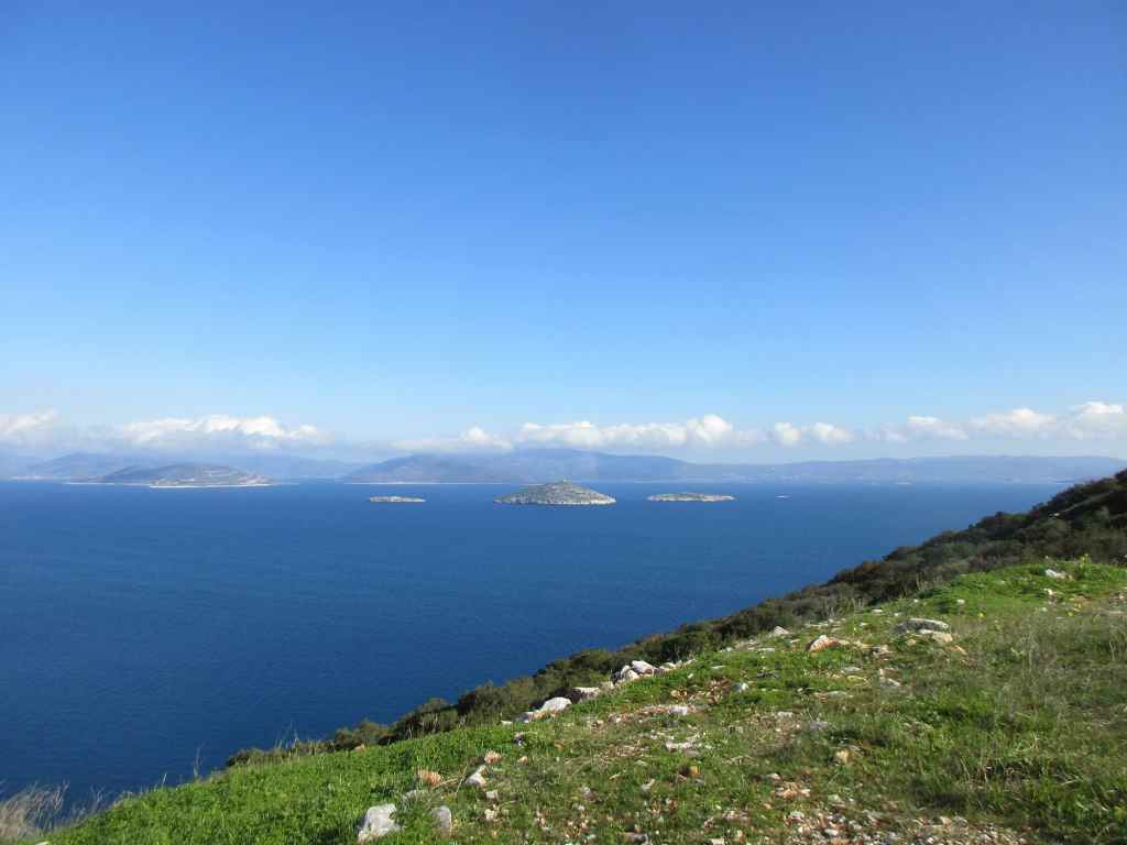 Etwas mühsam kämpfen wir uns entlang eine Serpentinenstraße, bis wir fast oben am Berg stehen, ein paar Häuser hier und da. An einer Steinbank finden wir einen phantastischen Aussichtspunkt. Wir köpfen ein „Ankerbier“. Vor uns liegen das Meer mit mehreren Inseln, hinter uns der kleine Fährhafen von Agia Marina. Am Abend im Lichtermeer ist alles noch mal so schön.