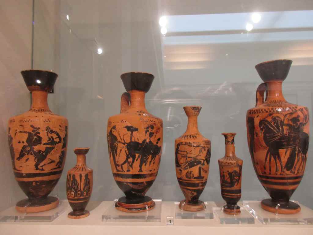 Die Skulpturen sind schön in Szene gesetzt. In den Vitrinen sind einige interessante Keramiken aus 1400-1200 v. Chr. zu sehen – kleine kuglige Vasen, Gefäße für Lebensmittel, Krüge – viele mit der typischen schwarz bemalten Dekoration.