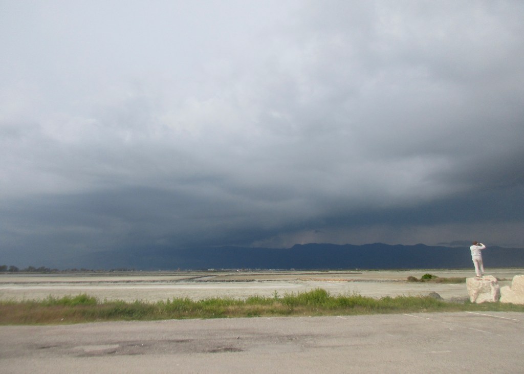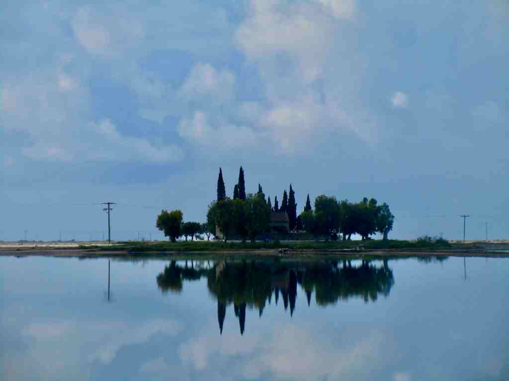 Die Landschaft in Griechenland könnte nicht unterschiedlicher sein. Morgens Blütenpracht und am Abend stehen wir im Kontrast – karges flachen Land. Nichts als Salzfelder wohin das Auge schaut. Die Häuser stehen auf Stelzen und sind nur durch Stege miteinander verbunden.