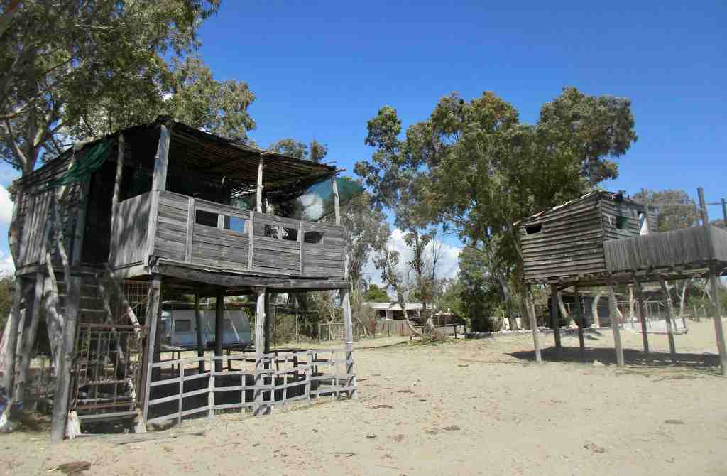 abgewrackte Strandhäuschen auf Stelzen stehen