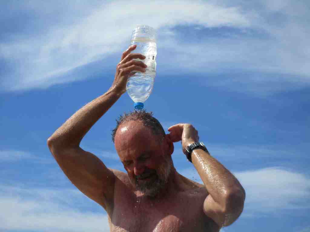 Da es meist in unmittelbarer Nähe zum Womo keinen Baum gibt, um unseren Duschsack aufzuhängen, haben wir eine neue Duschidee. Wir stellen drei Plasteflaschen mit Wasser einfach in die Sonne. Und so haben wir täglich solarwarmes Wasser für eine Dusche.