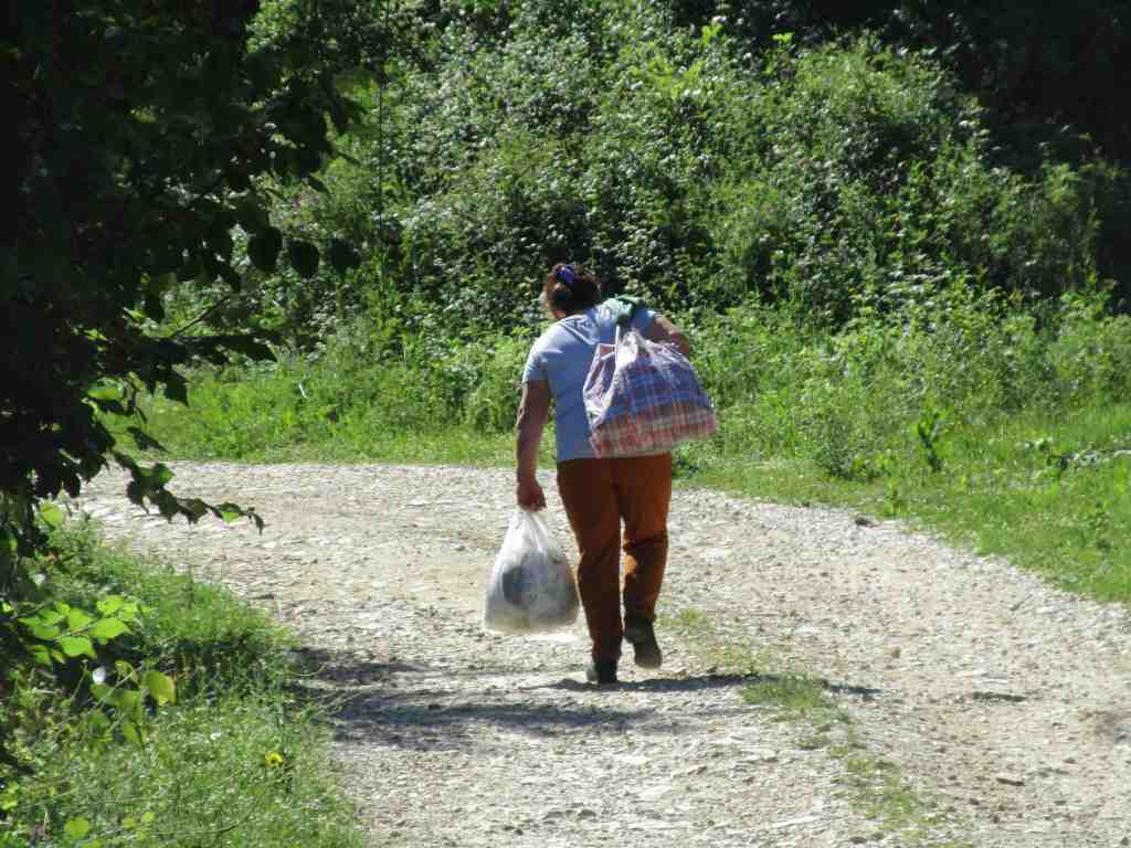 Der Caravan ist zu schwer für die Brücke, die nur mit Brettern ausgelegt und mehrfach geflickt wurde. Pkw fahren noch darüber. Wir laufen lieber an die andere Uferseite. An der Weggabelung befindet sich ein Kirche. Das Tor wird gerade von einer Frau geschlossen. Wir entscheiden uns nicht in die Kirche zu gehen, sondern der Frau zu folgen. Sie trägt schwere Taschen und das schon eine Weile, denn wir haben sie schon beobachtet, wie sie von der Hauptstraße gekommen ist. Trotz der schweren Taschen ist sie uns immer mehrere Schritte voraus. Es sind keine Häuser zu sehen, nur eine Gasstätte. Wo will sie hin? Neugierig geworden gehen wir ihr weiter hinterher, irgendwo muss sie ja wohnen und da muss ja auch das Dorf sein. Sie macht Pause, nimmt einen Bonbon und bietet uns auch einen an.