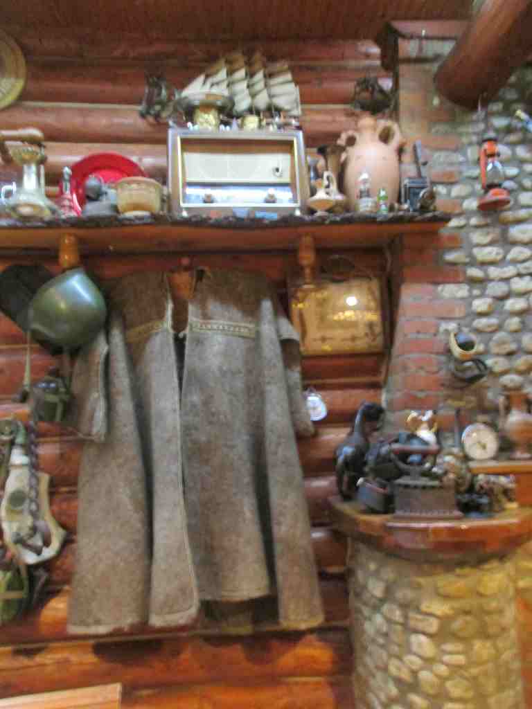 Sofra Kolonjare Agrotourismus ist unser nächster Stop nachdem wir einen Flickenteppich von Straße im Regen hinter uns gelassen haben. Hier erwartet uns eine gemütliche Baude, ja fast schon ein kleines Privatmuseum mit traditionellen Kostümen an der Wand, Hirtenumhängen und allerlei Utensilien aus früheren Zeiten. Auch der Vorgarten ist liebevoll gestaltet. Erinnert uns alles sehr an die Zeit im Altvatergebirge in Tschechien bei Opi.