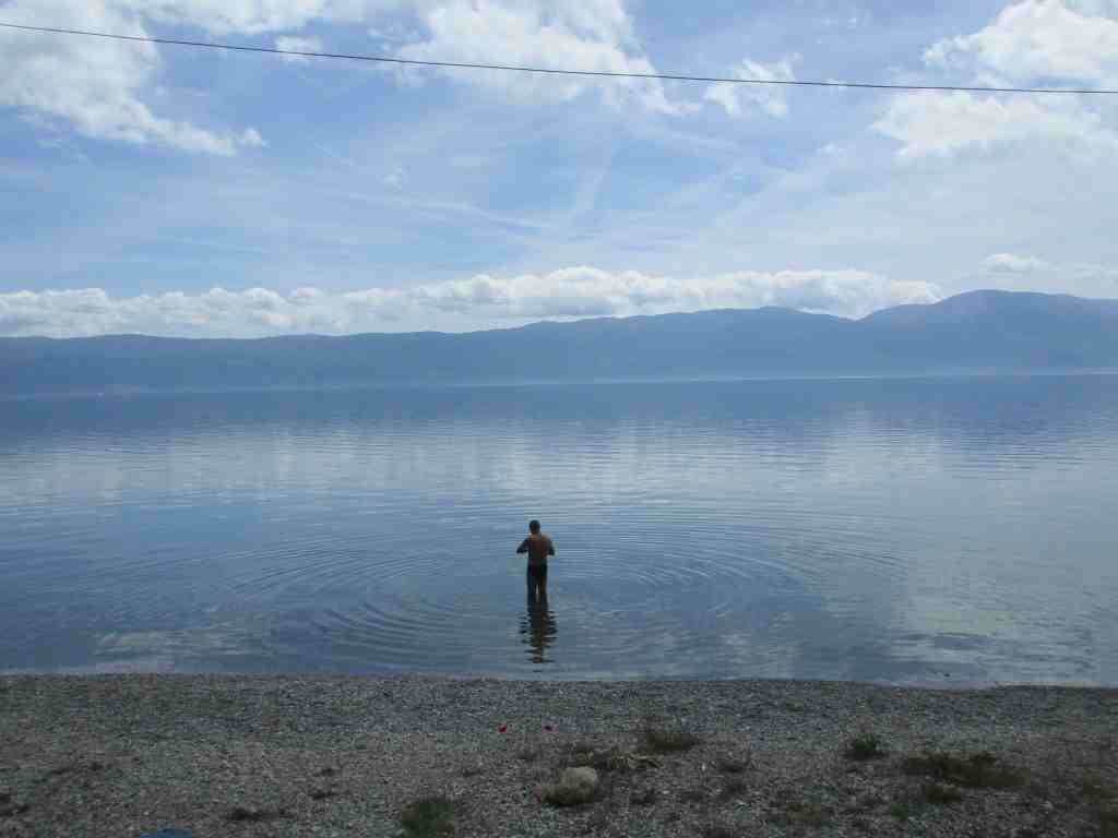 Es weht nur ein leichter Wind, der das Wasser kaum bewegt. Neugierig schwimmt eine kleine Würfelnatter heran und ein Frosch hat uns bemerkt. Das war es! Der große Ohridsee strahlt eine Ruhe aus, wie ihn wir aus Europa kaum noch kennen. Mehr Ruhe geht nicht, es ist noch einmal der richtige Ort zur richtigen Zeit – sozusagen Halbzeit, um uns ein neues Land zu erschließen. Seit wir die Grenze überschritten haben, sind wir viel gefahren und machen hier mal richtig Pause.