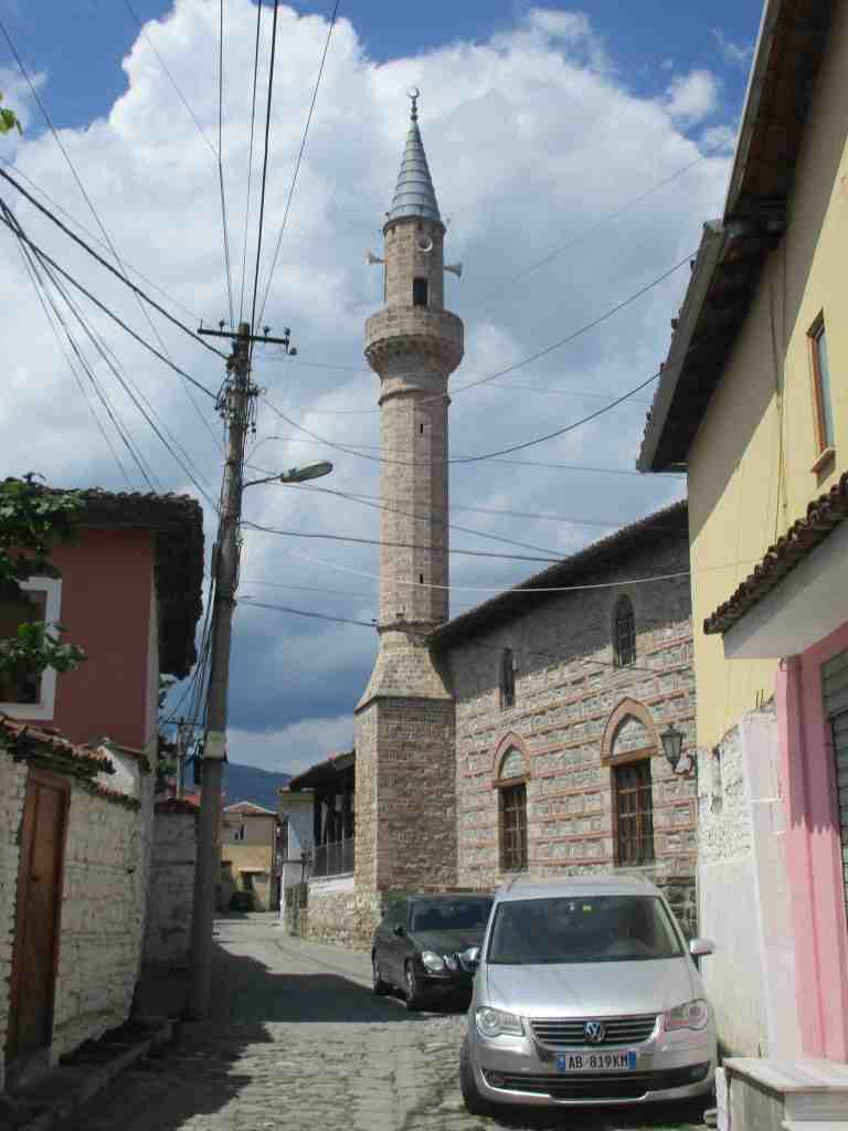Bei uns geht es weiter in Richtung Tirana. Und endlich klart auch das Wetter wieder auf. In der Stadt Elbasan besichtigen wir die Altstadt – auf altem Kopfsteinpflaster laufen wir an maroden Häusern entlang, lediglich die Eingangspforten sind schön anzusehen. Spricht man hier jemanden an oder wird angesprochen, wird man ihn nicht mehr los. Wir wollen unser Englisch in der Praxis testen, doch die anderen können die Sprache meist perfekt oder zumindest besser und texten uns dann zu. So hören wir im Souvenirshop einen Vortrag über die Stadt Berat, in der Kirche werden uns Infos über Bilder und Ikonen aufgezwungen nicht ohne einen Obolus an Mutter Maria und am Börekstand fängt sich Hendrik einen merkwürdigen Typen ein, der sich als Tourist aus Israel erklärt und am Ende noch unsere Telefonnummer haben will.