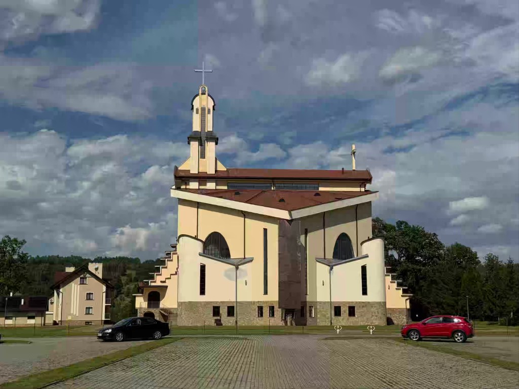 Auf dem Platz ziehen wir Wasser bevor es weitergeht, um an der nächsten Kirche zum Mittagessen zu halten. In Polen habe wir in der kurzen Zeit gefühlt so viele Kirchen gesehen, wie in keinem anderen Land, das wir in diesem Jahr bereist haben. Beinahe In jedem Ort gibt es mindestens eine, in größeren mehrere, die neuesten in eigenwilligen Baustilen.