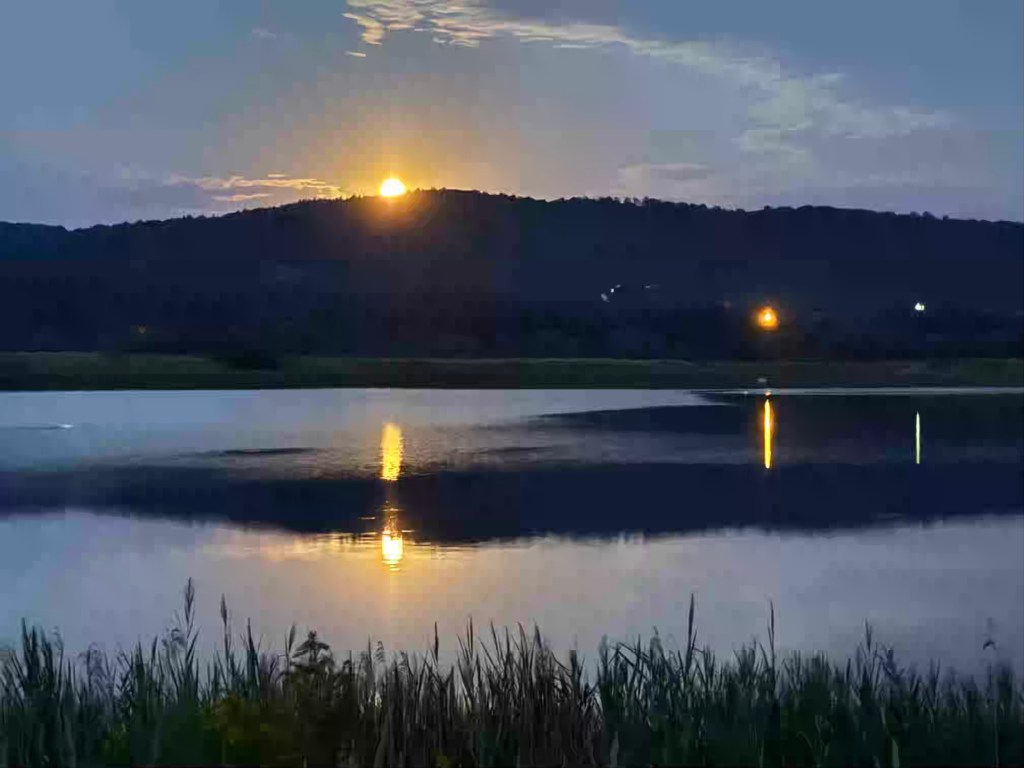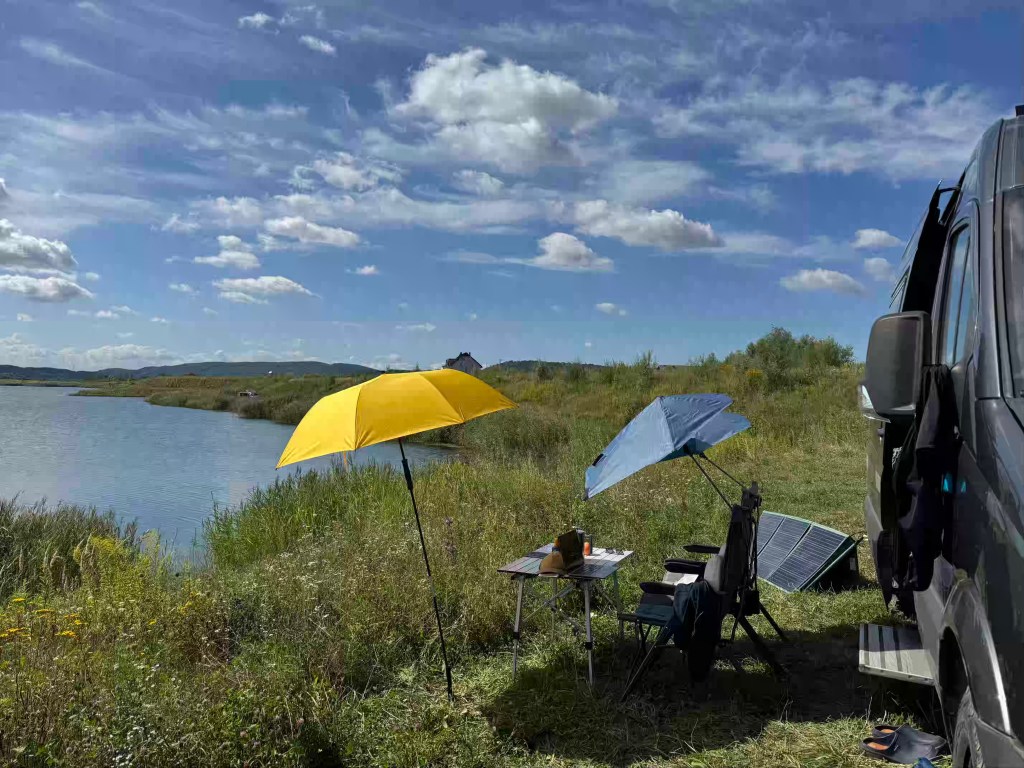 Hier genießen wir den Vollmond und die lebendige Atmosphäre um uns herum. Am Montag Morgen ist wieder Ruhe und wir haben die Seeidylle ganz für uns allein. Nur ein Lkw fährt in Abständen hin- und her und erinnert uns daran, dass eine neue Arbeitswoche begonnen hat. Die Polizei war auch schon da, hat nur freundlich gegrüßt. Die Welt steht ja nicht still, weil Feuerstein reisen will. Mit unserem Equipment sehen wir auch schon aus wie Influencer – aber wir sind es NICHT!!!