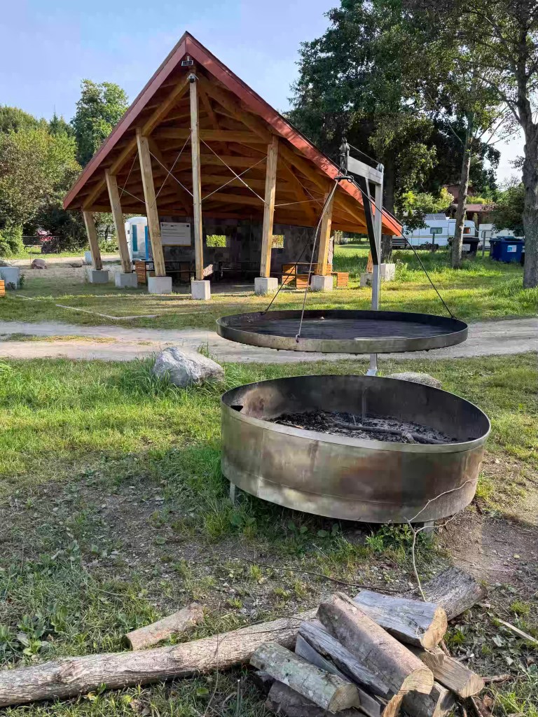 Wir befinden uns noch immer mitten in den Masuren. Ein wenig vermissen wir jetzt unser Kajak. Fast jeder See ist für eine Bootstour geeignet. Der Sommer ist zurück – 27 Grad! Am Dejguny-See im kleinen Ort Bogacko finden wir eine schöne Badestelle. Wasser hat allerdings nur noch 19 Grad. Am Nachmittag kommen die Einwohner und packen ihre Würstchen auf diesen Monstergrill.