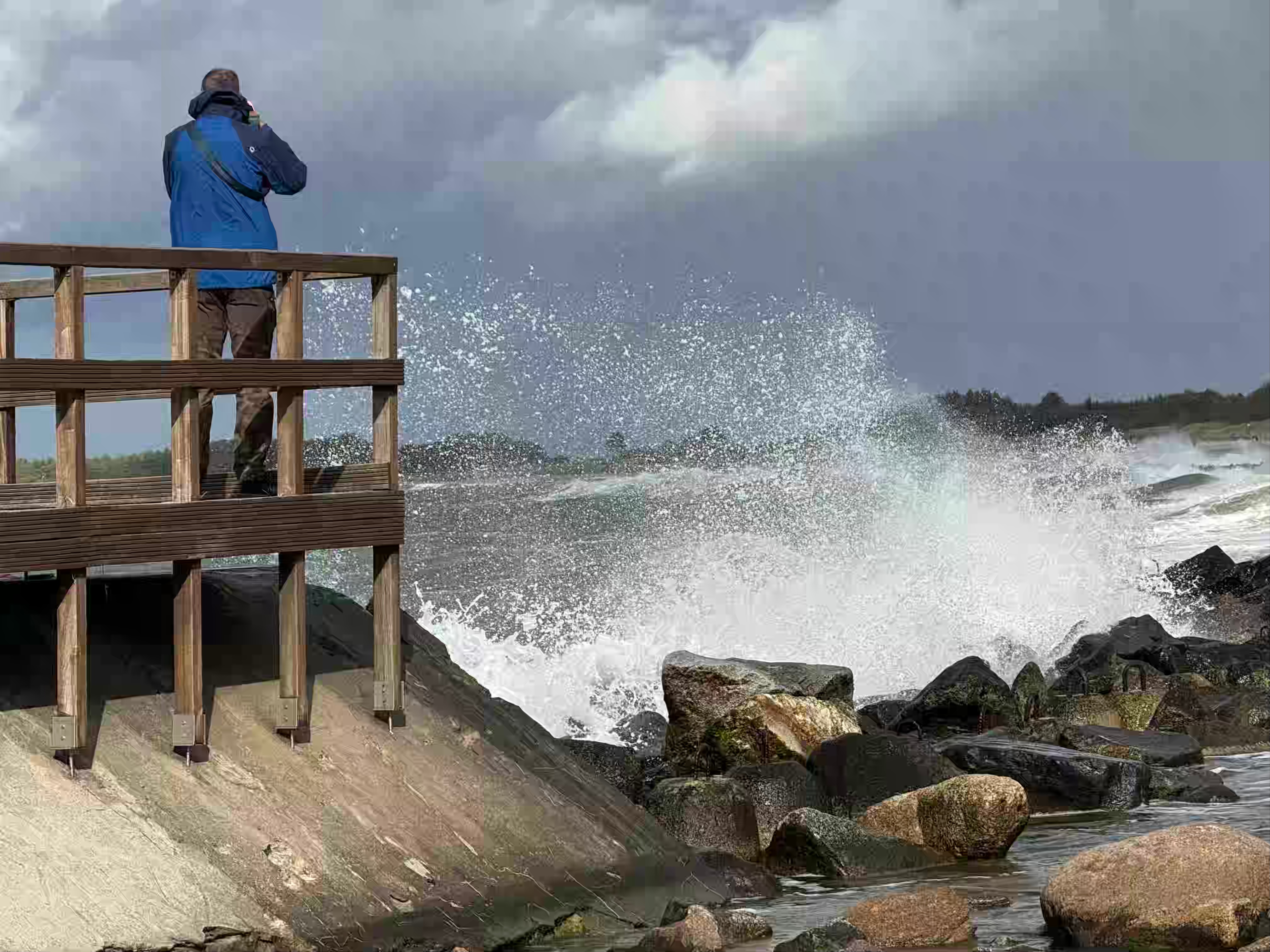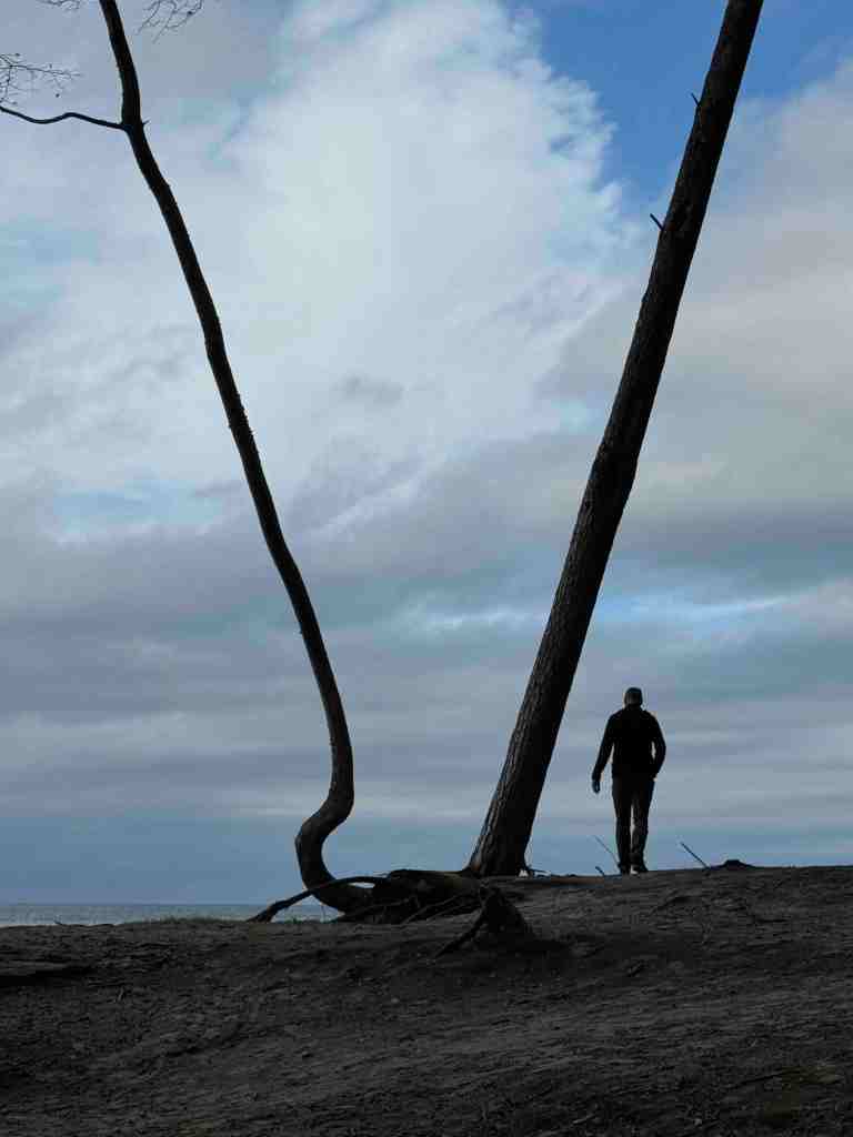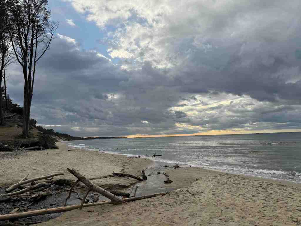 Wir stehen hinter einem Waldstreifen Nähe Rusinowo gleich hinter dem Strand. Die ganze Nacht rauscht das Meer und die Baumwipfel um uns herum krümmen sich in Wind und Regen. Wir müssen sogar im Womo kochen.
