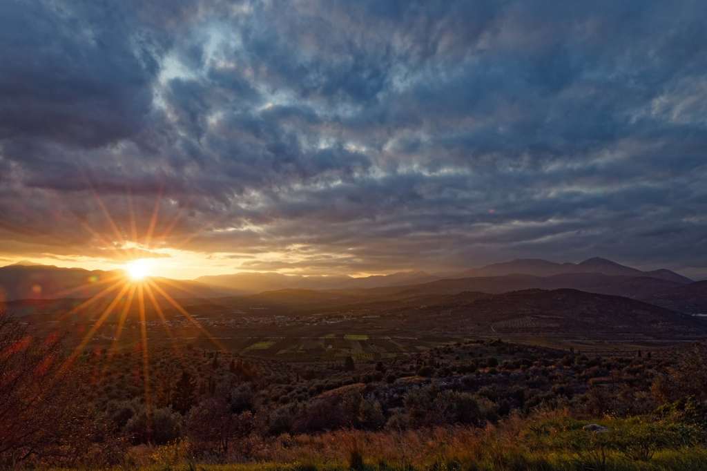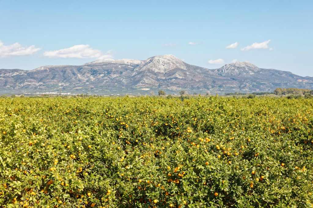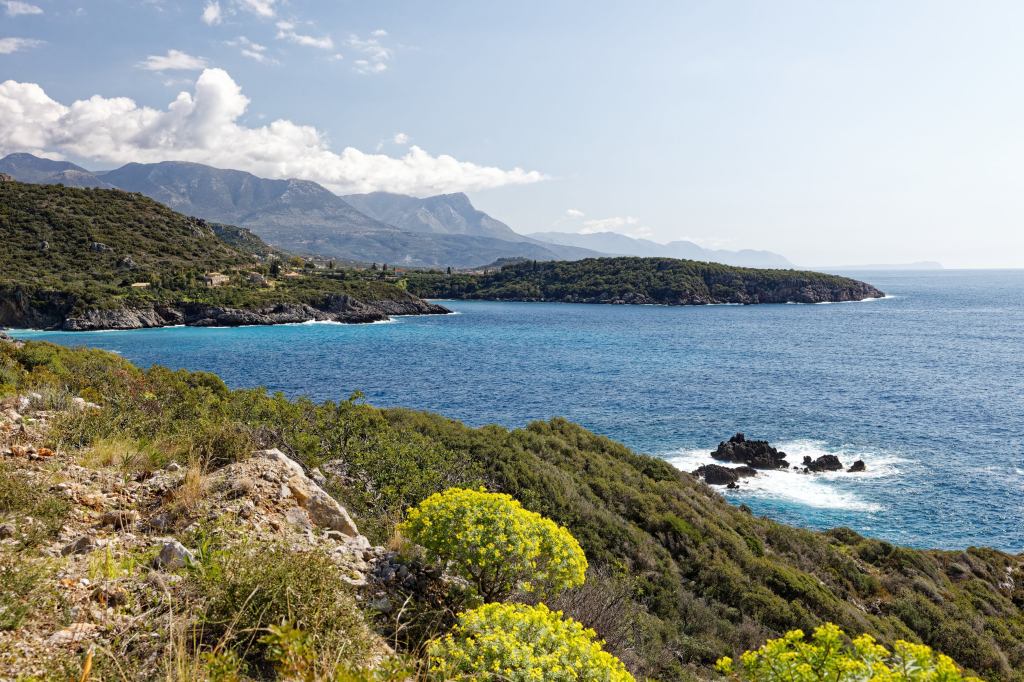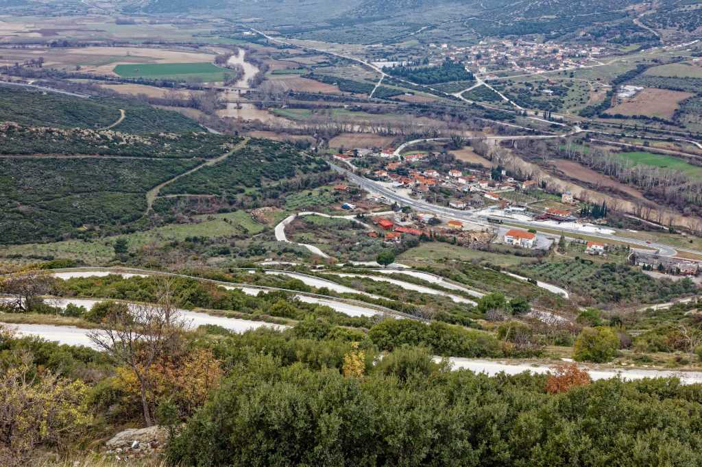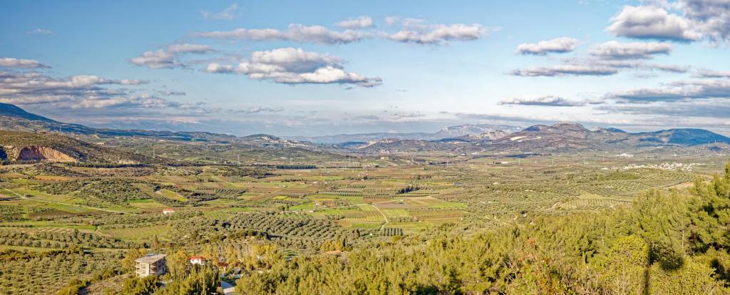 Blick übers Gebirge, dahinter liegt Kalamata und das Meer