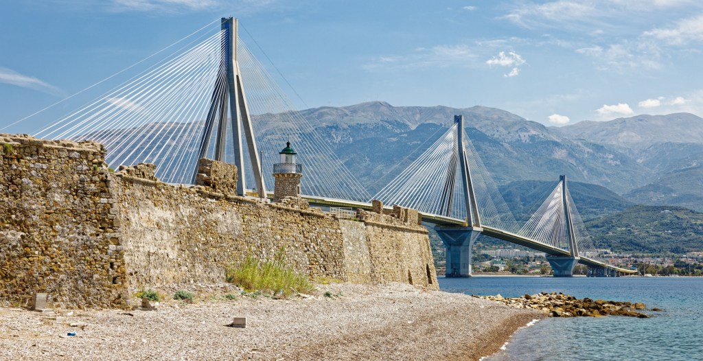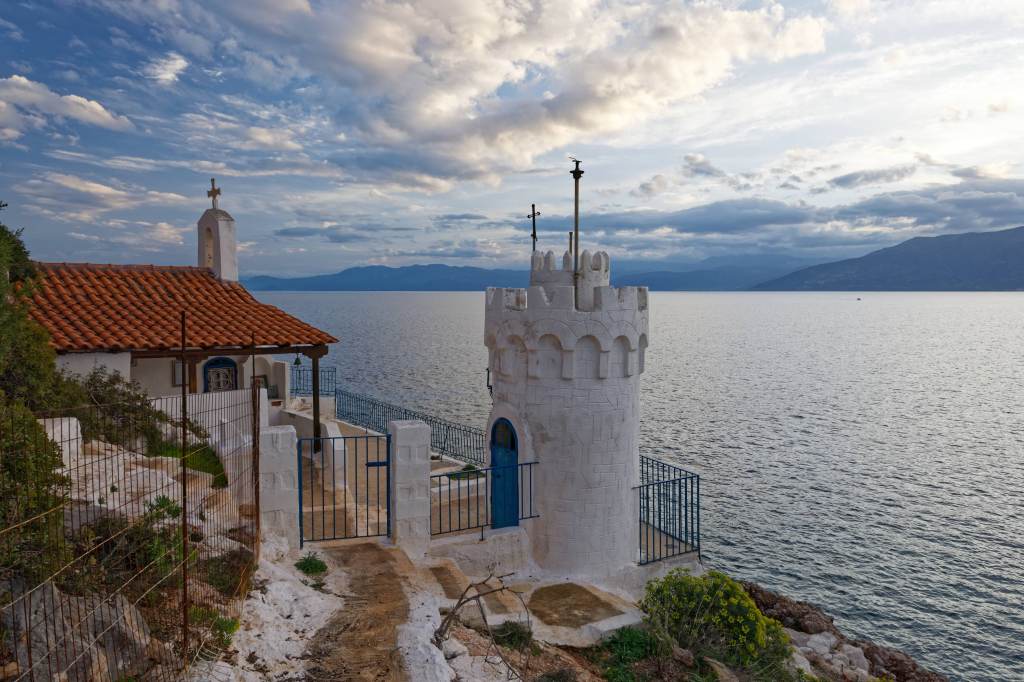 Blick auf die Bucht von Corinth, an der Spitze der Leuchtturm Melagavi
